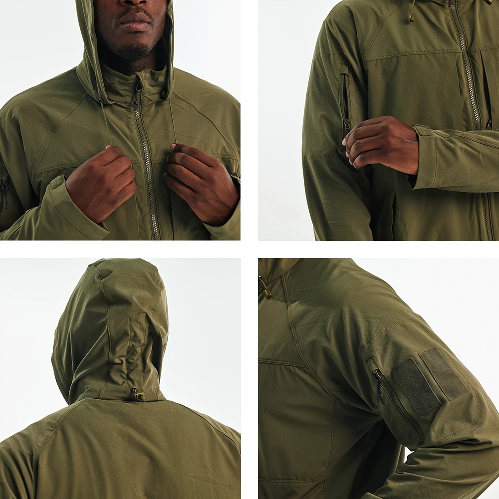 This lightweight waterproof jacket is designed for men who need comfort, flexibility, and weather protection in outdoor and tactical environments.