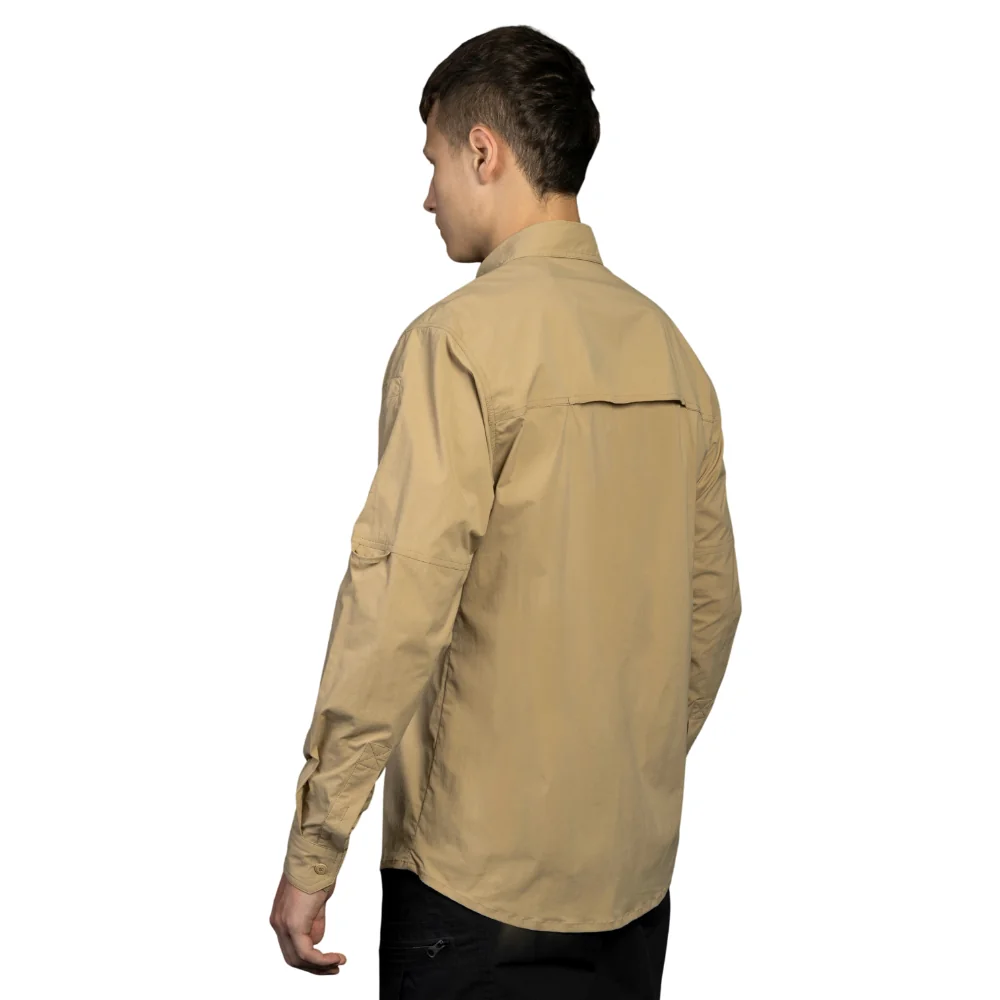 Lightweight khaki men’s hiking shirt with ripstop fabric and long sleeves for outdoor trekking and camping.